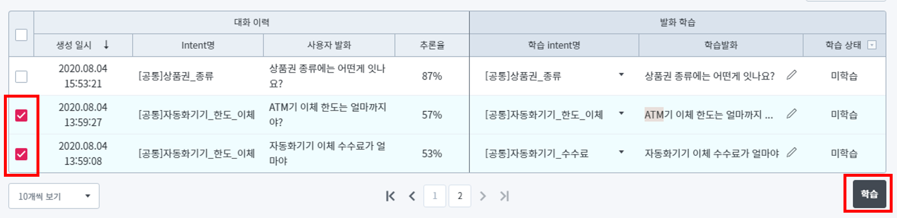 학습할 발화에 대한 수정이 끝나면 학습할 행들을 선택한 뒤 아래 ‘학습’ 버튼을 클릭해서 학습을 진행합니다.